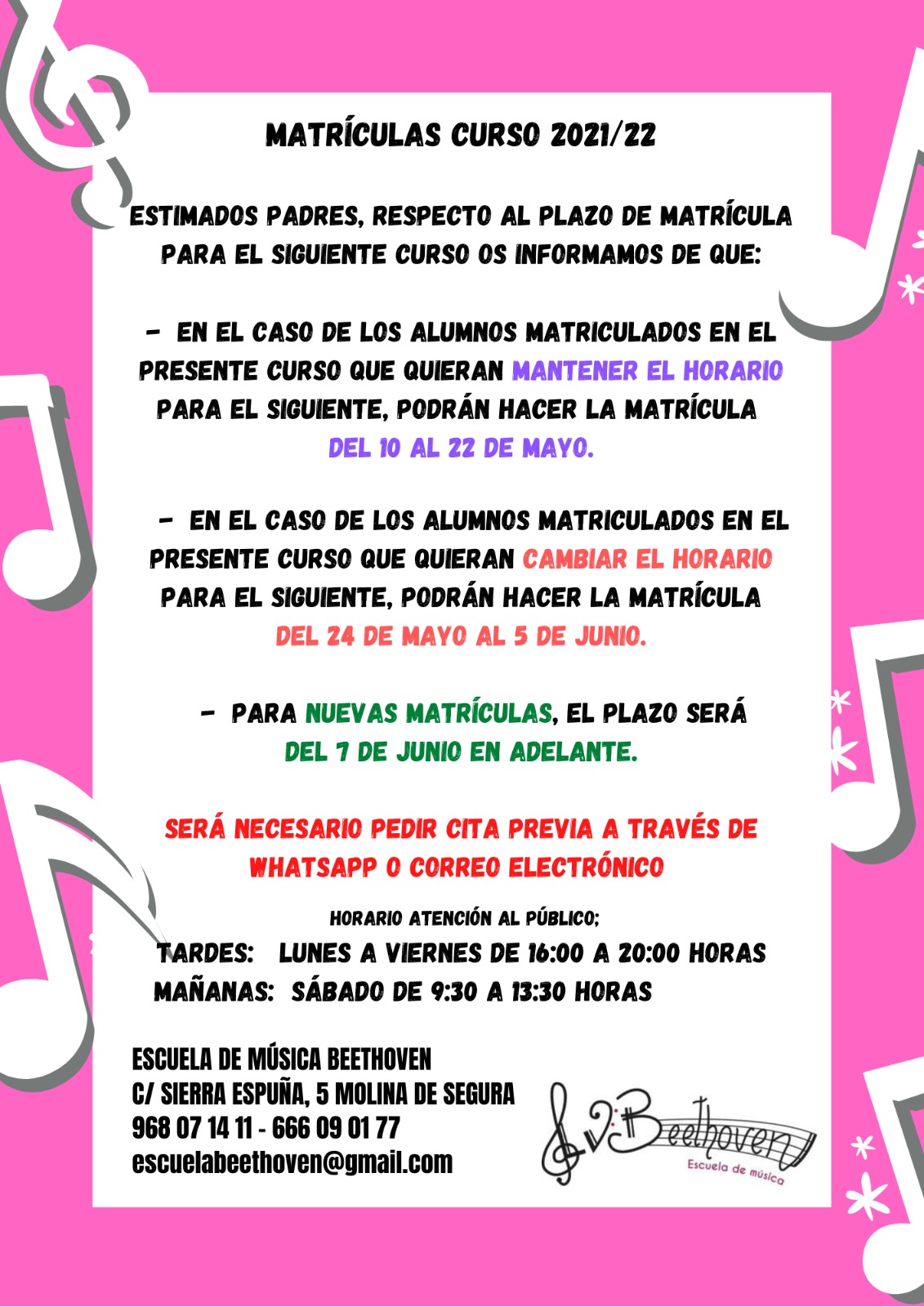 Os dejamos las fechas de matriculación para antiguos y nuevos alumnos. Será imprescindible solicitar cita previa para realizar la matrícula vía correo electrónico (escuelabeethoven@gmail.com) o enviando un whatsapp al 666 09 01 77. Os esperamos!